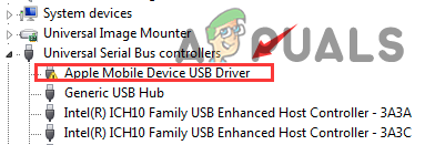 - Now expand the section Universal Serial Bus Controllers and click twice on Apple Mobile Device USB Driver option.