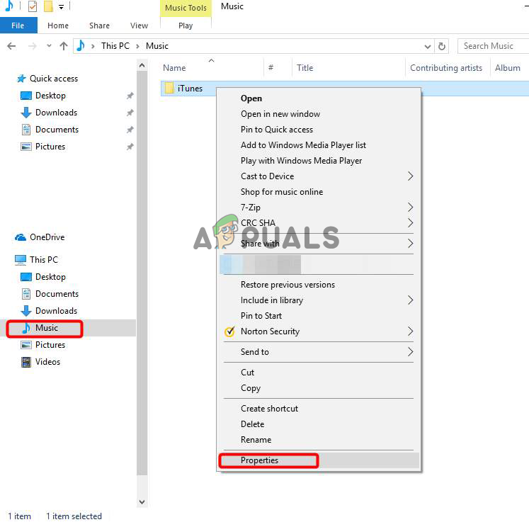- Now tap on the Music folder and right-click on iTunes and go for the option Properties.