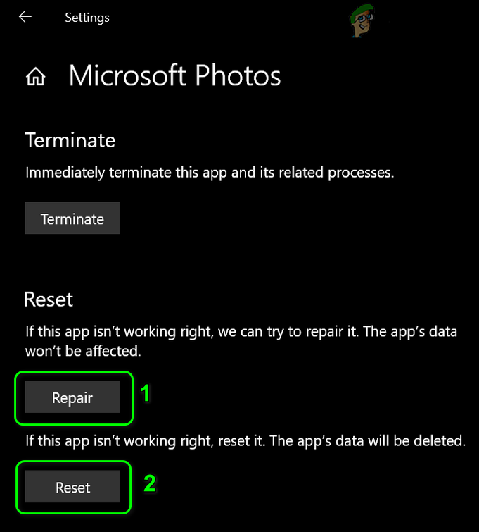 Solution 5: Repair or Reset the Microsoft Photos Application