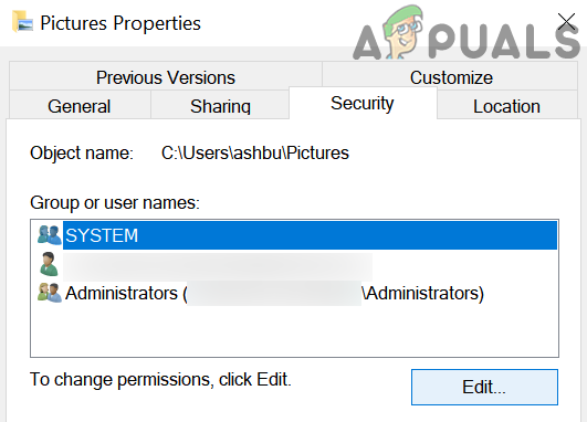 - Now navigate to the Security tab and click on the Edit button. If you cannot edit the security permissions of the folder, you may have to take ownership of it.