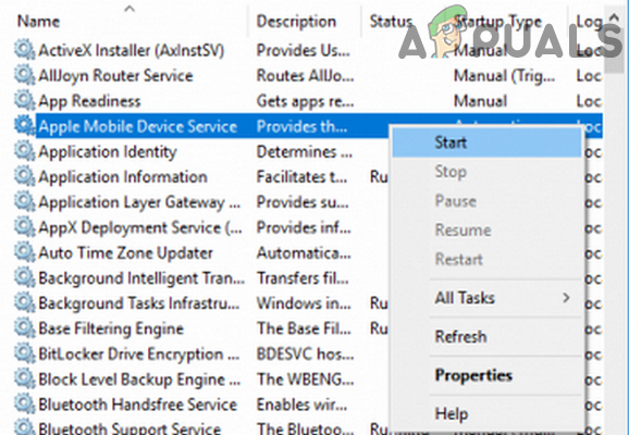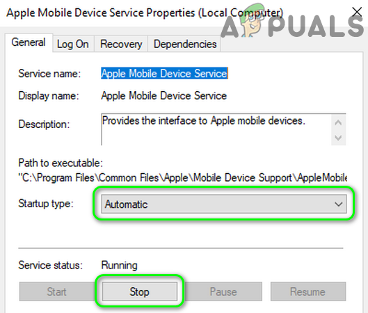 Open the Startup Type of Apple Mobile Device Service to Automatic and Stop it - Then click on Apply/OK & in the Services window, right-click on the Apple Mobile Device service.