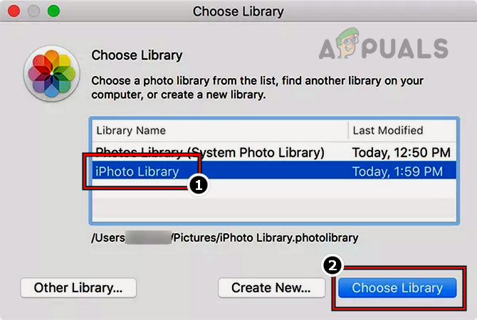 - Then select the iPhoto Library and click on Choose Library.