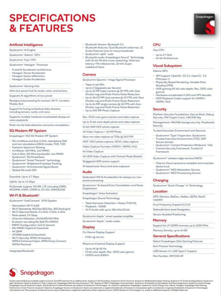 Coming into more details on the processor, the Snapdragon 782G is equipped with a 8-core Kryo CPU with speeds up to 2.7Ghz. It features Qualcomm’s X53 5G Modem with sub-6 GHz Cellular speeds. Detailed specifications are mentioned below: