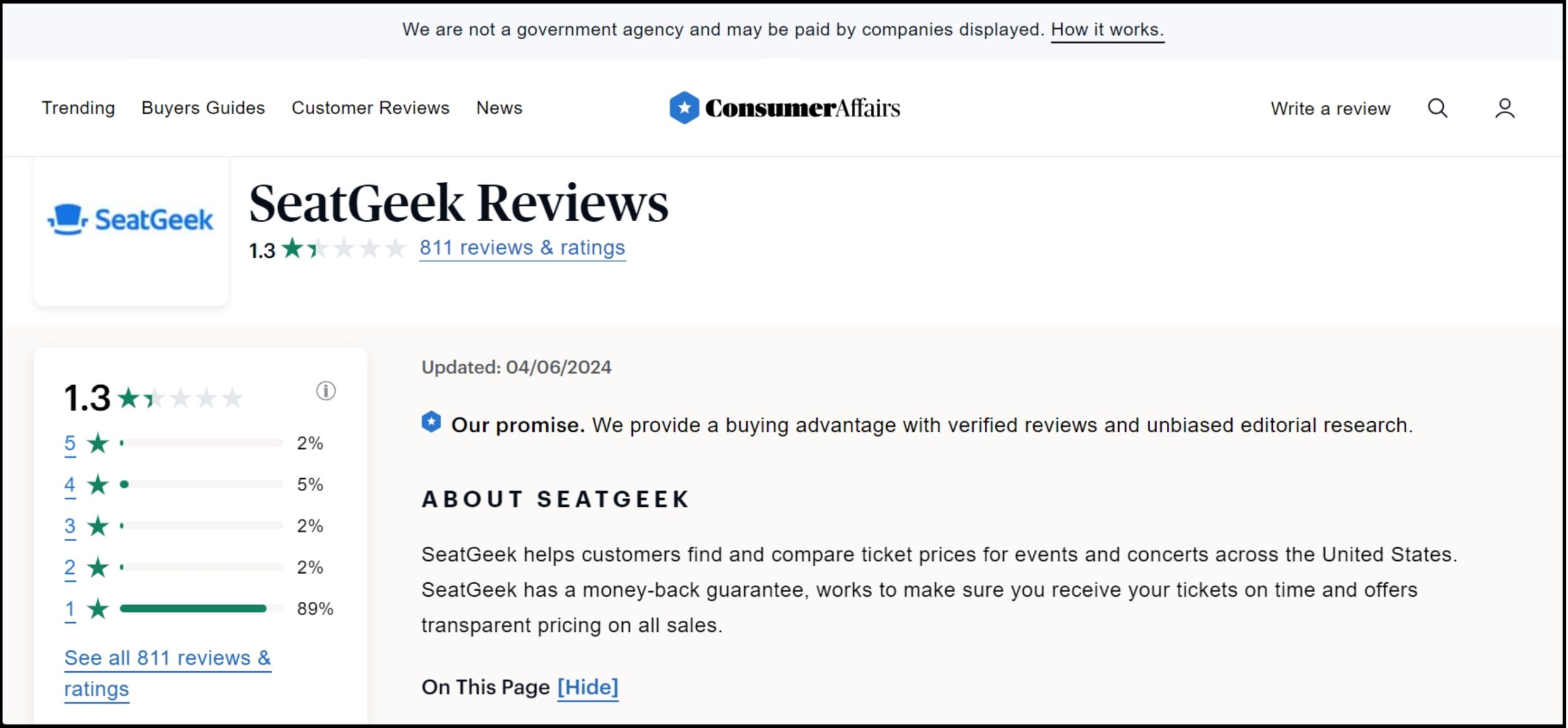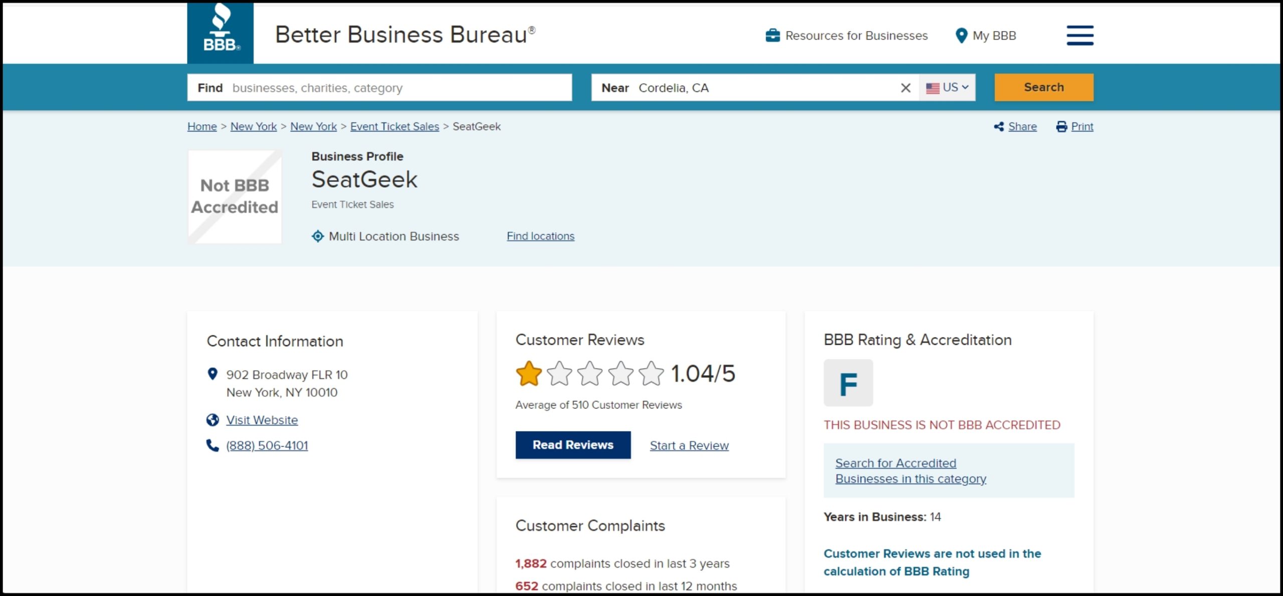 On the Better Business Bureau (BBB), SeatGeek has an “F” rating and a much lower average customer review score, with common complaints about customer service and misleading listings.
