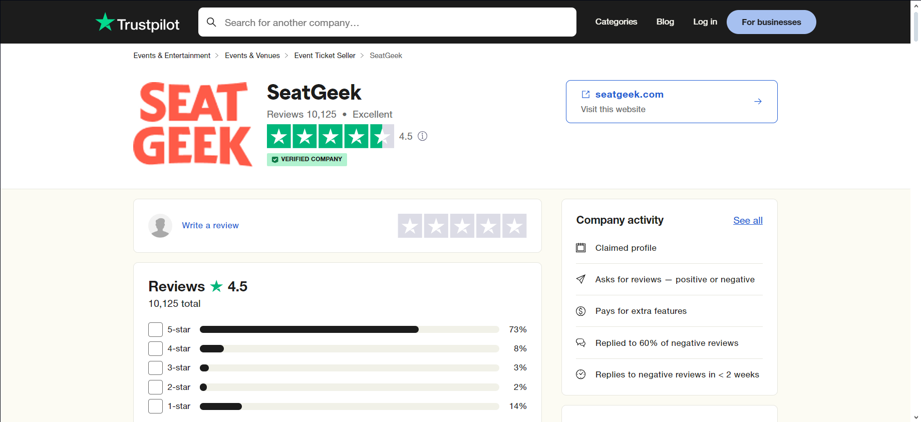 User reviews on SeatGeek vary across platforms. On Trustpilot, SeatGeek has a high TrustScore of 4.5 out of 5 from over 10,125 reviews, with 73% rating their experience as excellent. These reviews often praise the platform for its user-friendly interface and reliable ticket delivery.