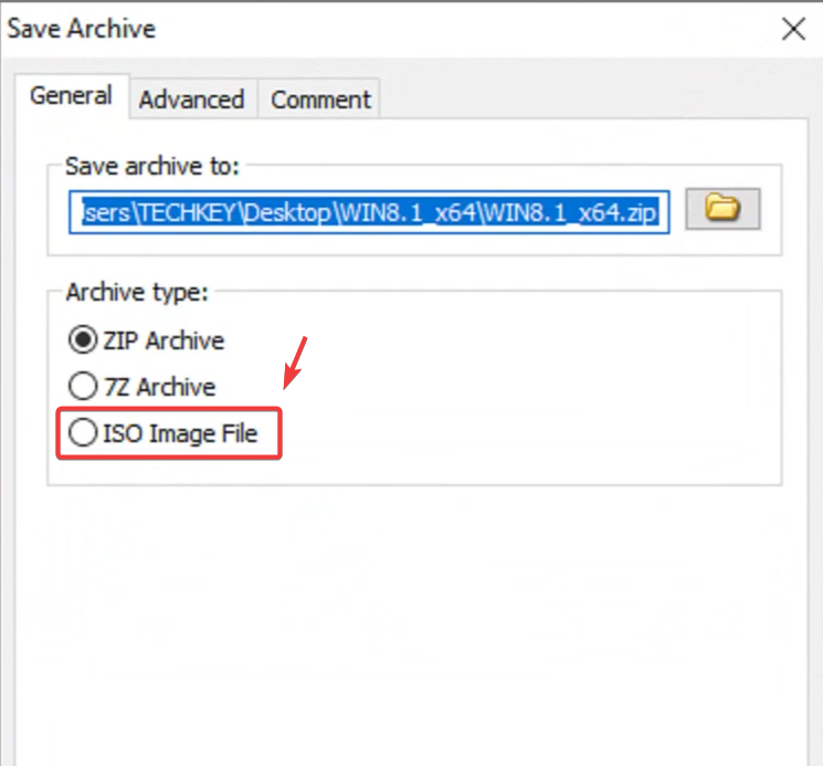 - In the archive settings, select ISO Image File as the archive type and click OK to create a new ISO file.