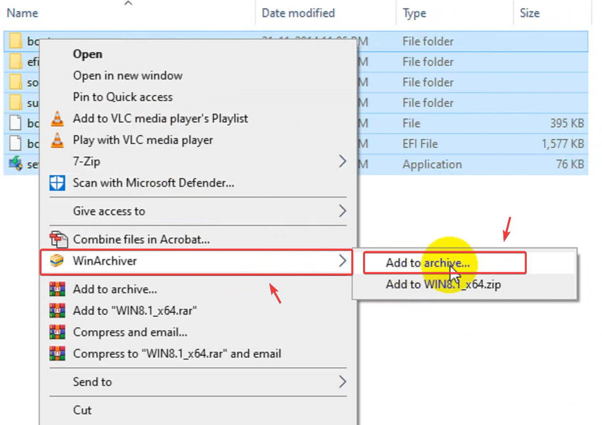 - Press Ctrl + A to select all files, then right-click, hover over WinArchiver, and click Add to Archive.