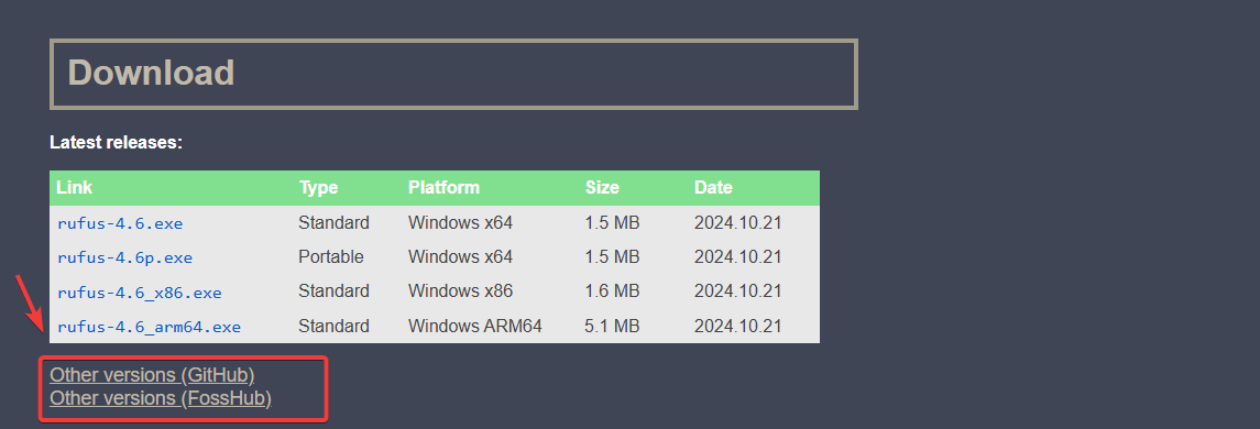 - You’ll see a list of all the older Rufus versions. Download one and try creating the bootable USB drive with it.