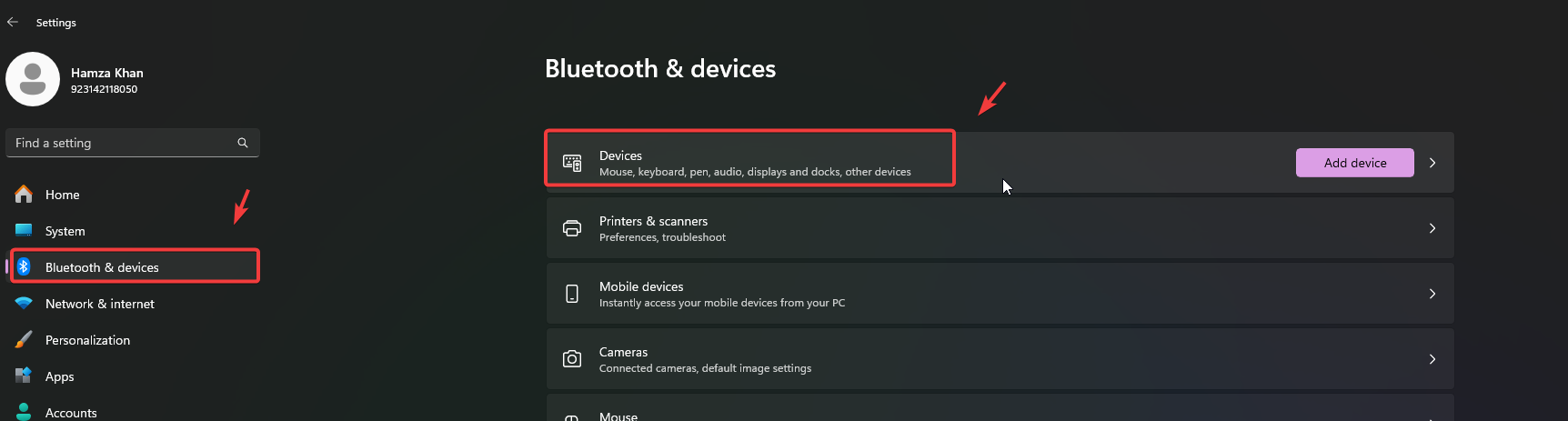 - Navigate to Bluetooth & Devices settings from the left pane and select Devices.
