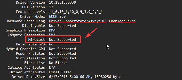 - Once you’ve done this, open the file. Press the CTRL + F keys, type Miracast, and click the Search Down icon. Now, seeing it Available next to Miracast means your device supports this technology. In my case, it does not support Miracast.