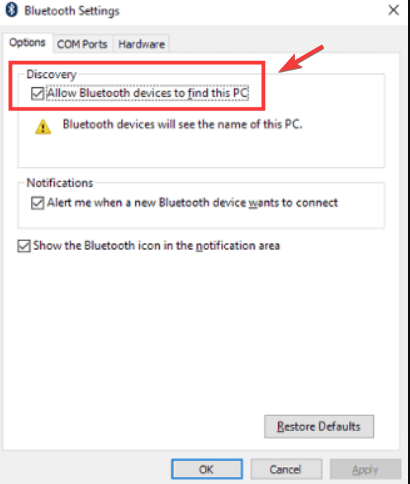 - Under the options tab, make sure that Allow Bluetooth devices to find this PC is enabled.