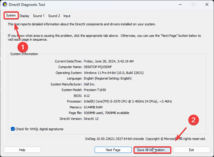 - In this window, click Save All Information. You will be asked to save a DxDiag file. Just save it in any location you want.