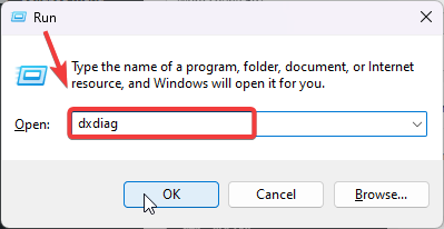 - Type dxdiag in the input box, click OK to run the command and open the DirectX Diagnostic Tool.