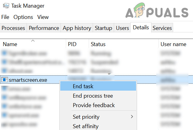 - Now, in the menu shown, click on End Task (do not end the Smartscreen process in the Processes tab, otherwise it will re-initiate) and then, click on the icon of the application’s installer in the Taskbar and proceed with the installation to check if the issue is resolved.