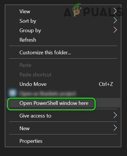 - Now, in the menu shown, select Open PowerShell Window Here (you may get a prompt to open the Command Prompt Window Here, if so, then proceed with it).