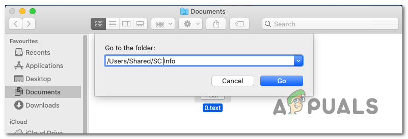 - Inside the text box associated with Go to the folder window, paste “/Users/Shared/SC Info” and hit Enter to navigate to that location.