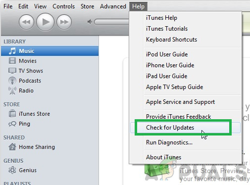 Selecting the Help option in iTunes. - Select “Check for Updates” from the list.