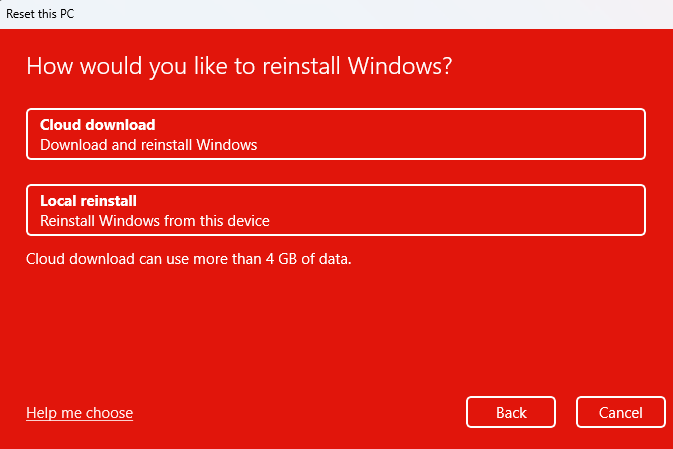 - On the next page, select “Cloud download” if you are connected to the Internet. This option will fetch a clean copy of Windows from Microsoft’s servers. You may also go for a “Local reinstall“, however, this option tends to result in failure if your current copy of Windows is corrupted.