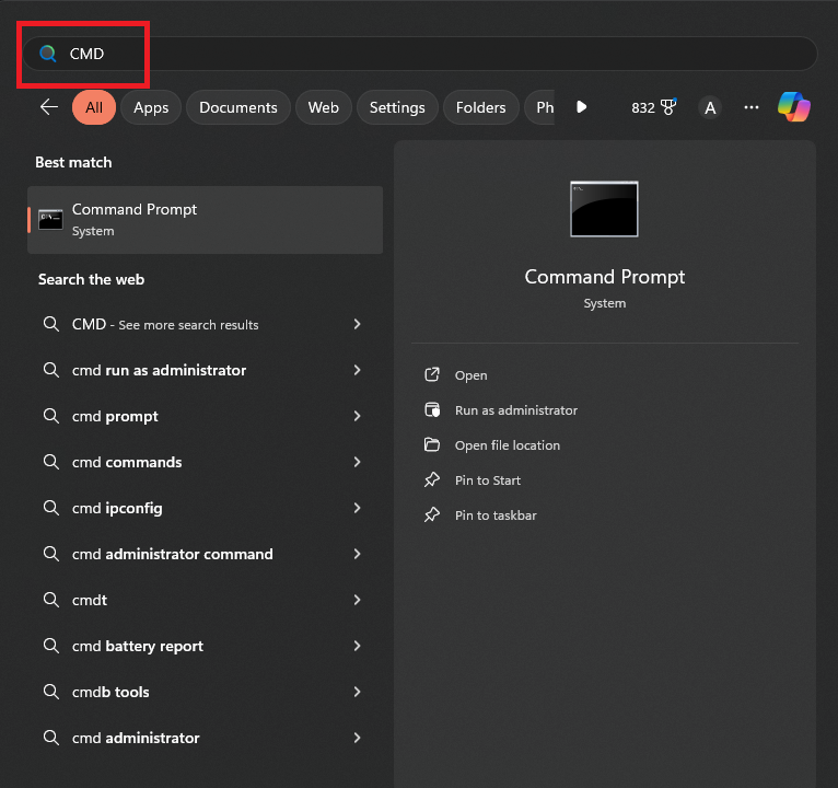 - Open the Windows Search Bar and search for the term “CMD“.