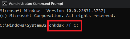 - Once you open an elevated CMD window, type the command “chkdsk /f C:“, without the double commas. It is important to note that “C” represents the drive letter where Windows has been installed. If your Windows is installed elsewhere, like “D” or “E“, change it accordingly.
