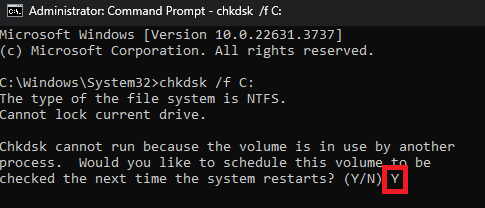 - If you get an error message stating, “The type of the file system is NTFS. Cannot lock current drive“, you will be given an option to perform a test on your next restart. Type “Y” after the question as shown in the image.