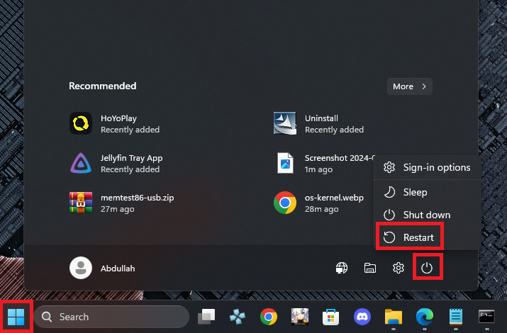 - Now restart your computer by pressing the Windows Icon in your taskbar >> Shutdown icon >> Restart.