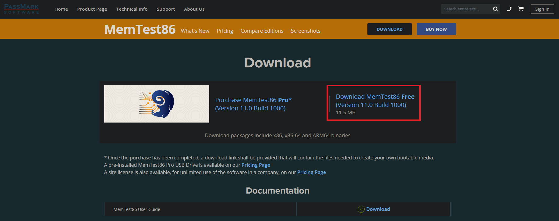 - For the sake of this guide, we shall use the Free version, so click on the “Download MemTest86 Free” option.