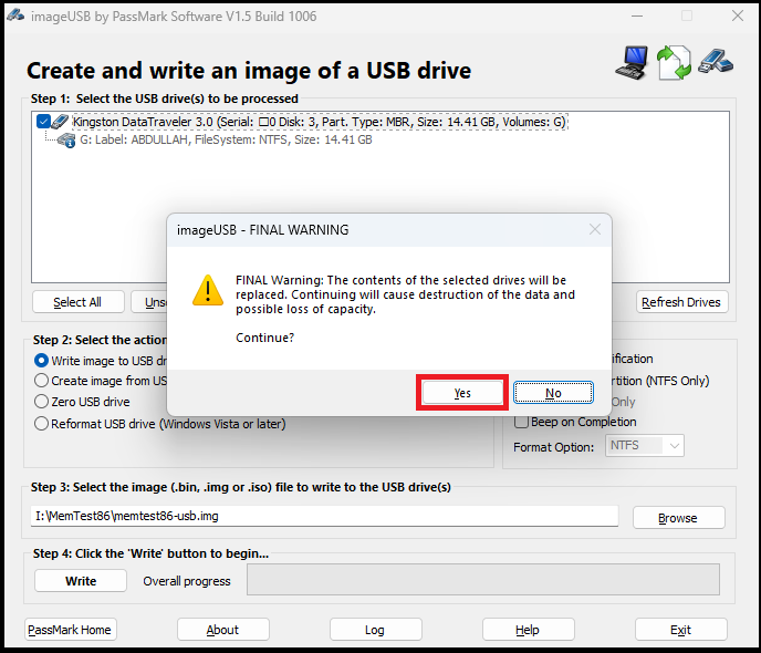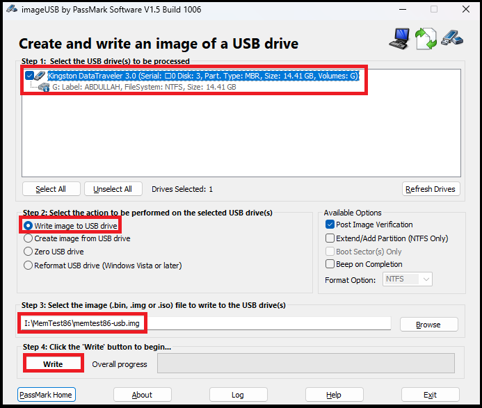 - Connect the USB Flash Drive to your PC and open the “imageUSB” executable file. In Step 1, select your respective USB Drive and choose “Write image to USB drive” or the first option in Step 2. In Step 3, make sure the “memtest86-usb.img” file has been selected since this is the file that will be copied to your USB.