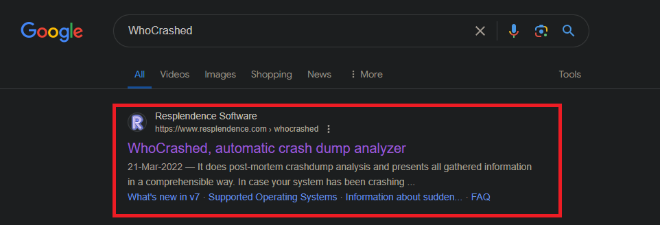 - Search “WhoCrashed” on Google and open the link by Resplendence Software. Verify the URL; “https://www.resplendence.com/whocrashed“.