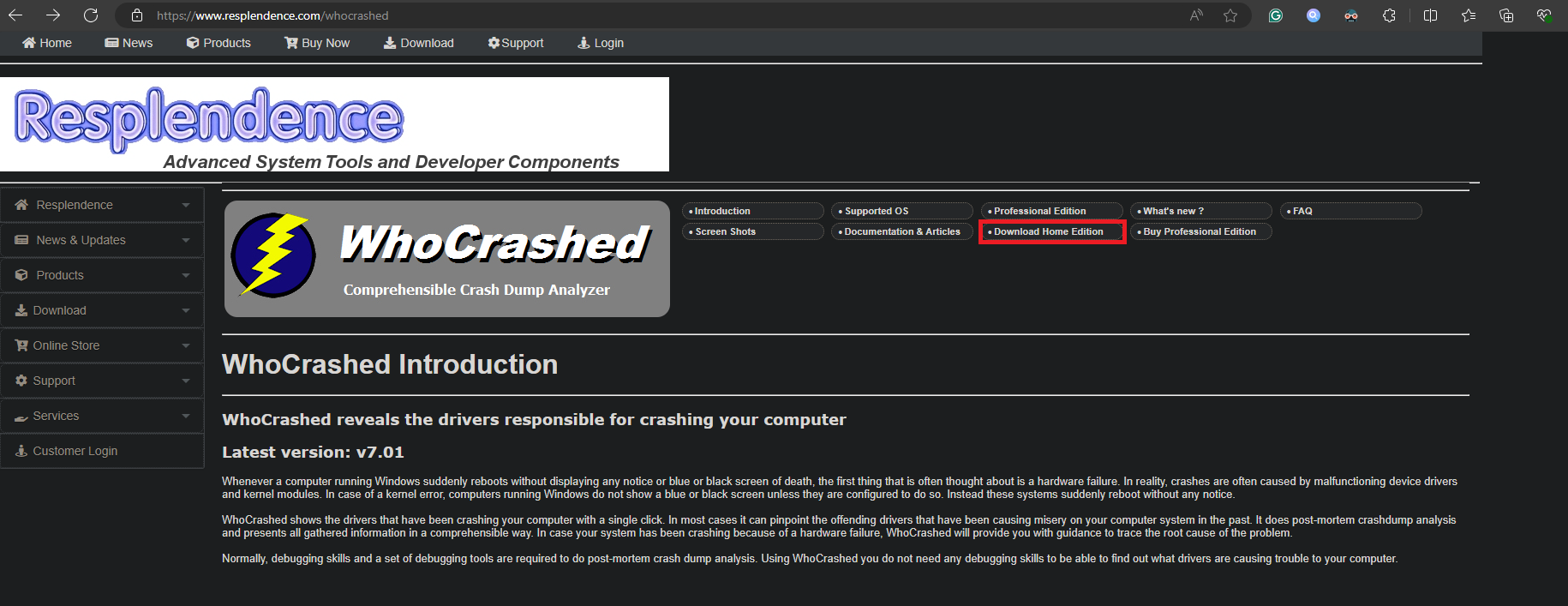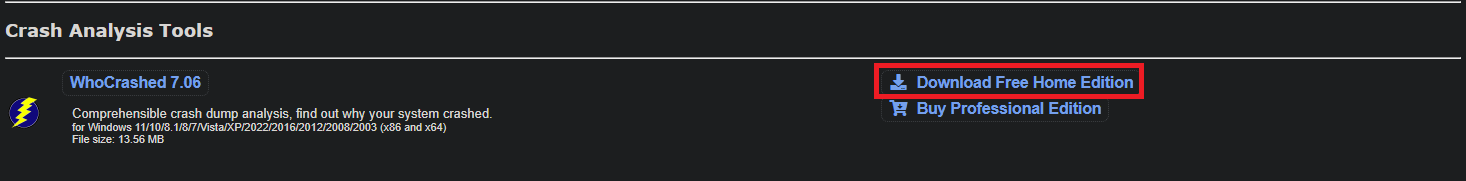 - A “Free Downloads” webpage will open. Scroll down until you see “WhoCrashed” under the “Crash Analysis Tools” category. Select “Download Free Home Edition“.