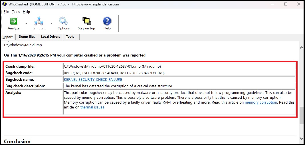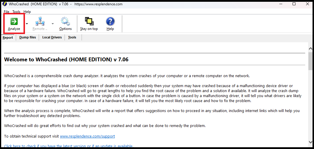 - Install the software and run it. Click on the “Analyze” button, which essentially looks through your dump files and tries to find the root cause of the error. Scroll down to see the synopsis.