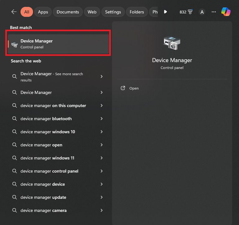 - To ensure the issue is not driver-related, search “Device Manager” in the Windows Search Bar and click on the first option.