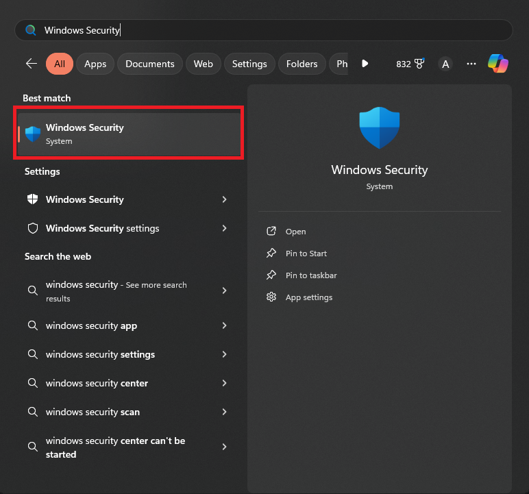 - Search “Windows Security” in the Windows Search Bar and select the first option.