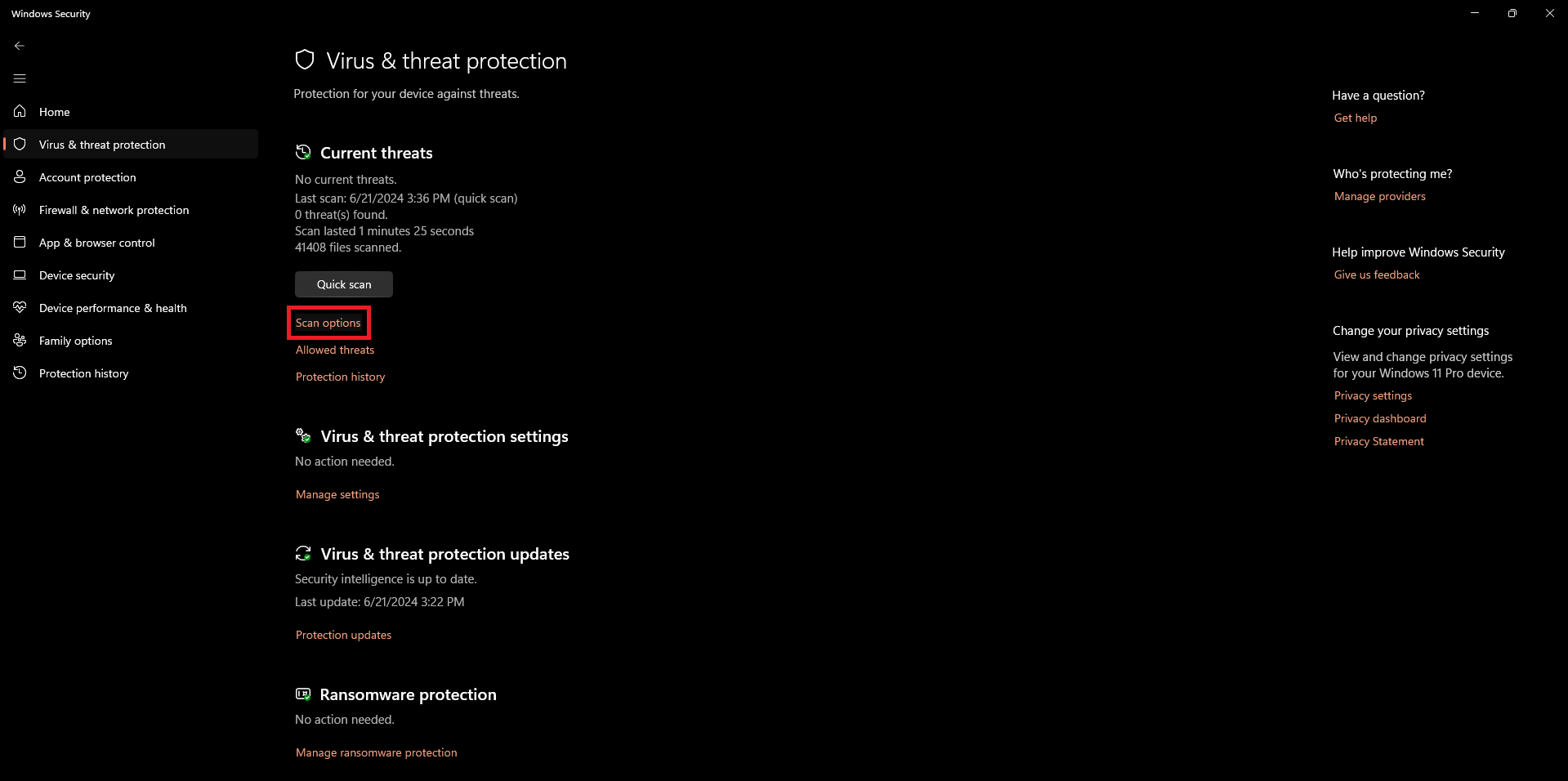 An overlooked suspect in the “Kernel Security Check Failure” BSOD is viruses. While viruses do not mostly intend to disrupt your evening with an unwanted crash, they may indirectly cause this issue. Hence, it is always a good idea to perform a thorough scan of your computer. You may use Windows Defender or any other antivirus for this purpose.