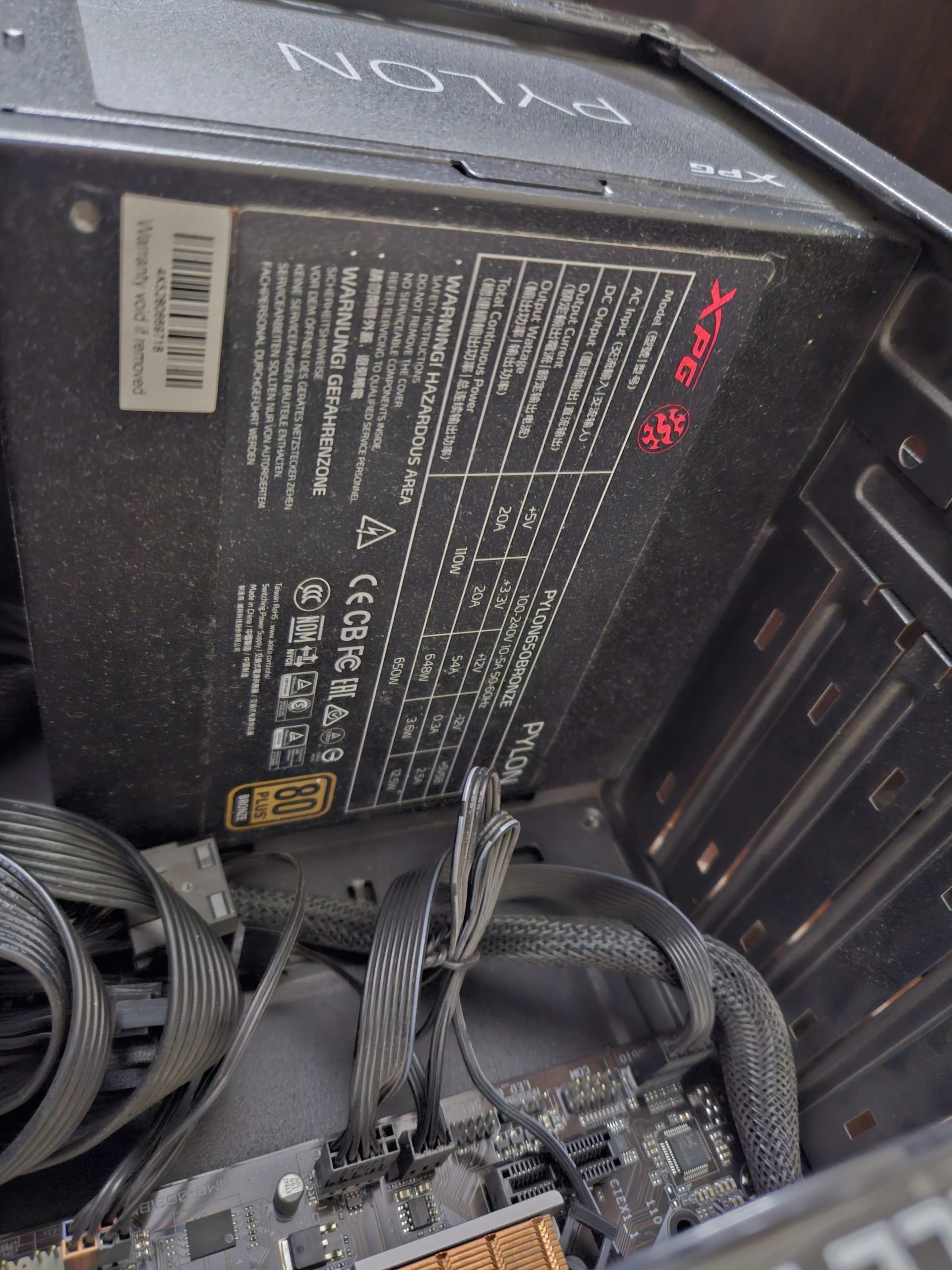 - From the top of the PSU, we can clearly see that this is the 650W (Total Continuous Power) variant of the XPG Pylon. If you have difficulty viewing the sticker, you should search for your unit on the Internet since specifications from most renowned vendors are easily accessible.