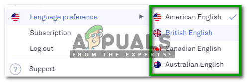 Select the Language Preference Option from the Menu that Appears - Finally, select any language dialect of your choice from British, Canadian, and Australian English as highlighted in the image shown below: