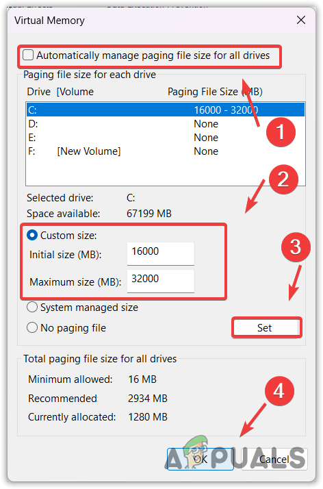 - Then, select ‘Custom size’ and input the values according to your physical RAM. The initial size should be equal to the physical RAM, and the maximum size should be 1 or 2 times the size of the physical RAM installed on your PC. For instance, if you have 16GB of RAM, you can set the initial size to 16GB, and the maximum size to 16 * 2, which is 32GB.