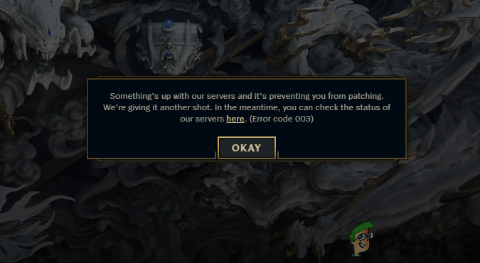 The “Error Code 003” is shown on League of Legends while the game is being patched or installed and it is usually caused due to high lag between the client and the server’s connection. This can be due to an issue with the server or with the internet being used by the client.