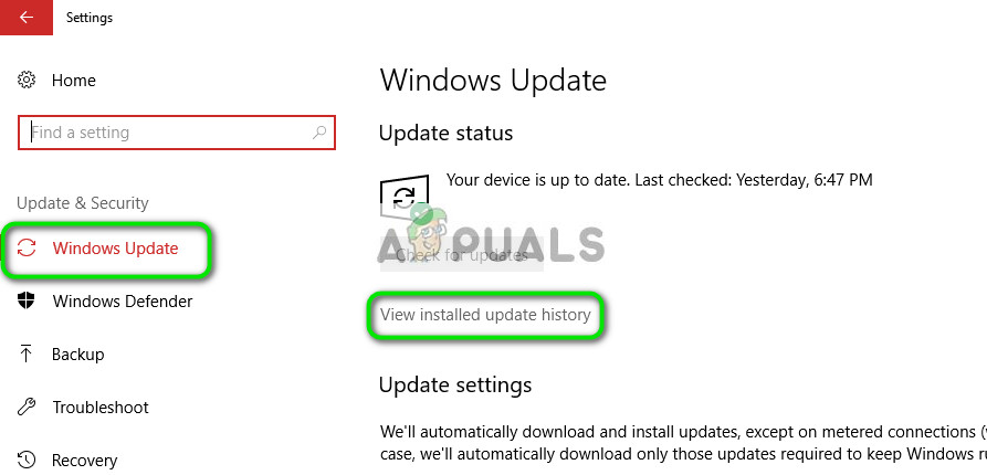 - Once in Settings, click on “Update and security”. Here, under the heading of Update status, click “View installed update history”.