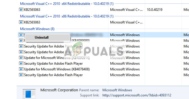 - A new window will be brought in front of you consisting of all the updates installed on your computer. Right-click on the one which was recently installed and click “Uninstall”.