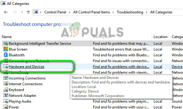 Hardware Troubleshooter is a utility present in the Windows operating system. It detects problems with your existing hardware and tries to resolve it after following a series of steps. We can try running the hardware troubleshooter and check if this does the trick.
