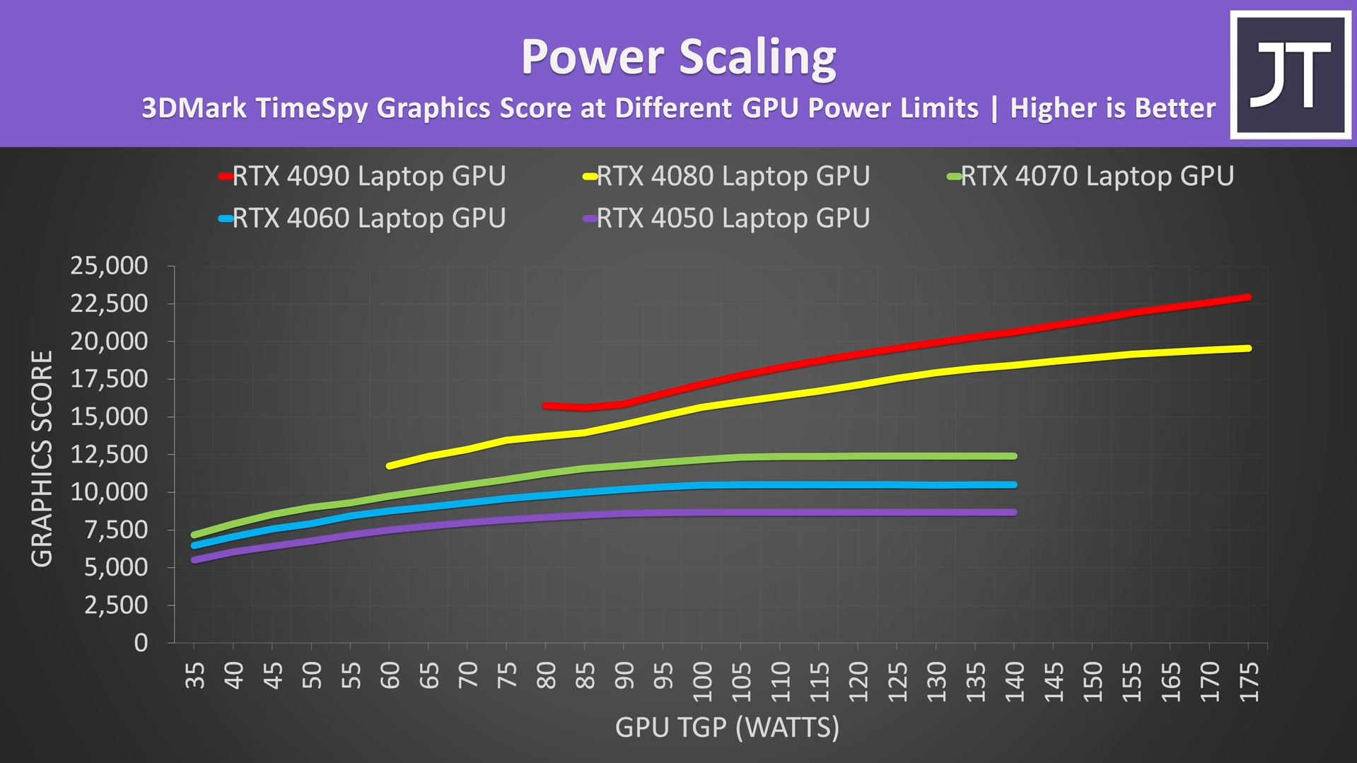 - Prefer a high-wattage GPU, though make sure you’re not overpaying for 140W RTX 4050, 4060, and 4070 variants as they barely scale past 100W. (Image Credit: Jarrod’sTech)