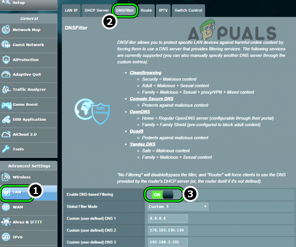 - Now open its Setup and in the left pane, head to the LAN tab (under Advanced Settings), and then in the right pane, head to the DNS Filter tab.