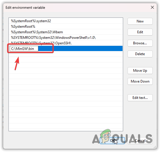 - Now click New and paste the MinGW bin directory path. This is where the Libstdc++-6.dll is located.