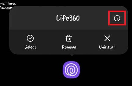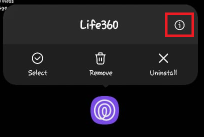 - Tap and hold the Life360 app icon, then tap on the Info icon on the top right side.