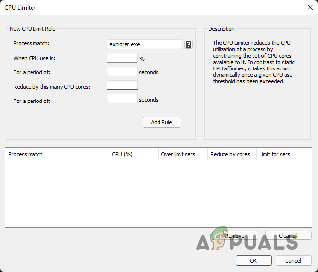 Opening up CPU Limiter - On the follow up window, you will be able to add a rule for when the CPU Limiter comes into action.