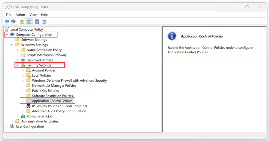 - Expand Computer Configuration > Windows Settings > Security Settings > Application Control Policies.