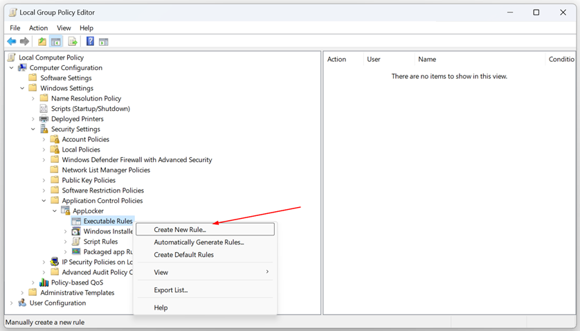 - Right-click on “Executable Rules” and select “Create New Rule…“.
