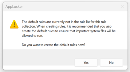 - Under ‘Do you want to create the default rules now?’, click ‘Yes‘. The default rules are not currently in the rule list for this rule collection. When creating rules, it is recommended to also create the default rules to ensure that important system files will be allowed to run.