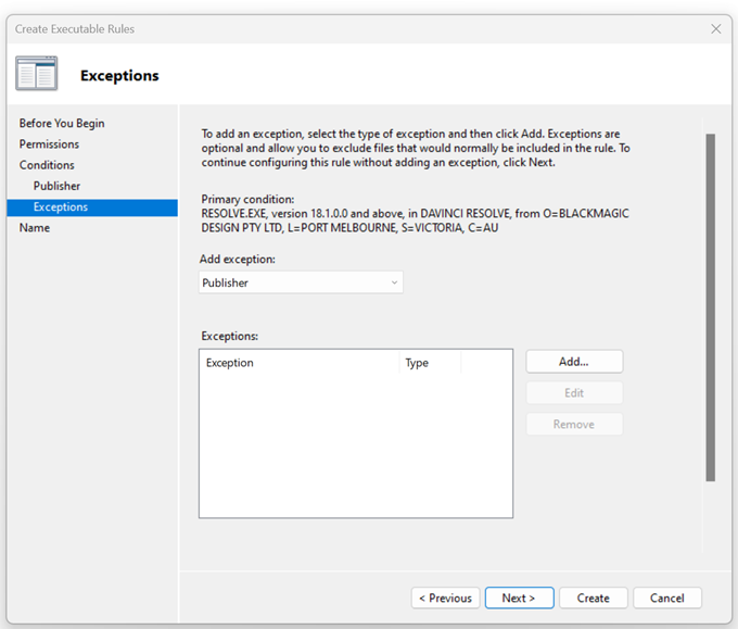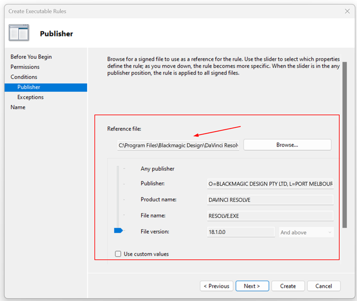 - In my example, I selected DaVinci Resolve software, which is used for video editing. You can also use the slider to select the properties that define the rule. As you move down, the rule becomes more specific. When the slider is in any publisher position, the rule is applied to all signed files.